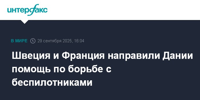 Москва. 29 сентября. INTERFAX.RU - Швеция и Франция объявили, что направляют Дании помощь по борьбе с беспилотниками на время саммита ЕС в Копенгагене, в том числе радиолокационные системы и вертолет.