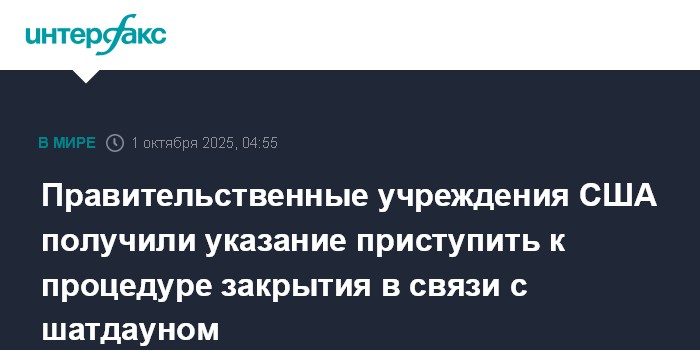 Москва. 1 октября. INTERFAX.RU - Управление административно-бюджетной политики Белого дома распространило указание федеральным правительственным ведомствам приступить к реализации планов по временному прекращению работы в связи с отсутствием финансирования (шатдауном), сообщили американские СМИ.