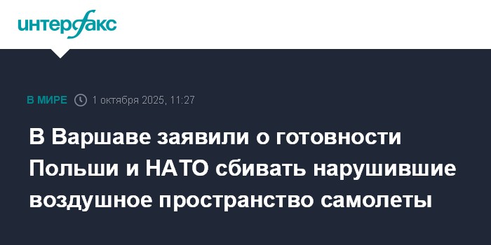 Москва. 1 октября. INTERFAX.RU - Министр национальной обороны Польши Владислав Косиняк-Камыш заявил о готовности Польши и НАТО в целом сбивать нарушившие воздушное пространство страны военные самолеты.