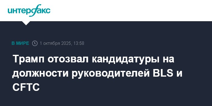 Москва. 1 октября. INTERFAX.RU - Президент США Дональд Трамп отозвал выдвинутых им ранее кандидатуры на должности руководителя Бюро статистики (BLS) Министерства труда и Комиссии по торговле товарными фьючерсами (Commodity Futures Trading Commission, CFTC) США.