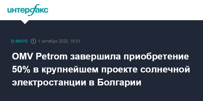 Москва. 1 октября. INTERFAX.RU - Румынская OMV Petrom завершила приобретение 50% в проекте солнечной электростанции Gabare, развиваемом австрийской Enery, мощностью 400 МВт в Болгарии, говорится в сообщении компании.