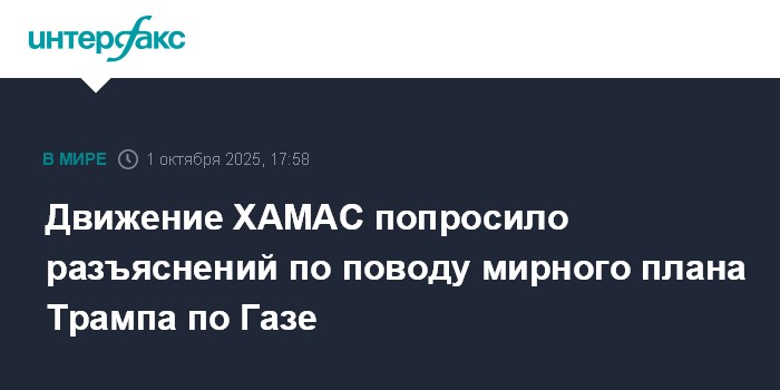 Москва. 1 октября. INTERFAX.RU - Движение ХАМАС просит разъяснения по ряду пунктов мирного плана США по Газе, в частности, по срокам вывода израильских войск, сообщает в среду саудовский телеканал "Аль-Хадат" со ссылкой на источники.