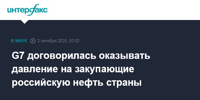 Москва. 2 октября. INTERFAX.RU - Страны G7 приняли решение усилить давление на страны, продолжающие закупать нефть у России, говорится в заявлении министров финансов "семерки".