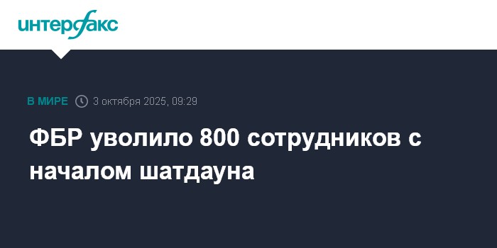Москва. 3 октября. INTERFAX.RU - ФБР США уволило 800 сотрудников бюро с началом временной остановки работы учреждений американского правительства из-за отсутствия финансирования, сообщил телеканал CBS.