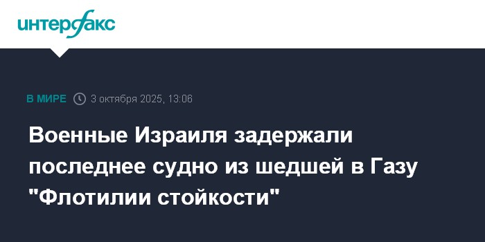Москва. 3 октября. INTERFAX.RU - Последнее из направлявшихся в сектор Газа судов с гуманитарной помощью в рамках "Флотилии стойкости" перехвачено израильскими военнослужащими, сообщается в телеграм-канале флотилии в пятницу.