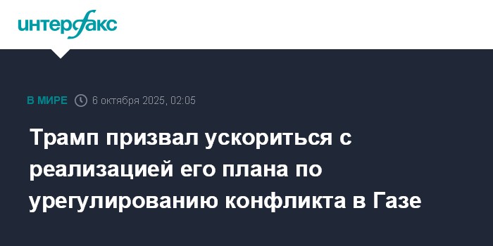 Москва. 6 октября. INTERFAX.RU - Президент США Дональд Трамп считает успешным ход урегулирования конфликта Израиля и палестинского движения ХАМАС, однако призывает стороны ускориться с реализацией его плана.