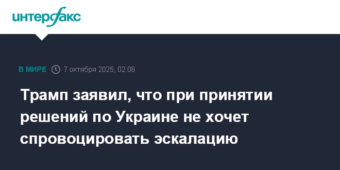 Москва. 7 октября. INTERFAX.RU - Президент США Дональд Трамп заверил, что при принятии решений по Украине, в частности, о передаче вооружений Киеву, стремится избежать эскалации конфликта.