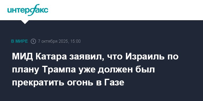 Москва. 7 октября. INTERFAX.RU - В МИД Катара заявили, что если Израиль поддерживает план президента США Дональда Трампа по урегулированию ситуации в секторе Газа, то он уже должен был бы полностью остановить боевые действия в анклаве.