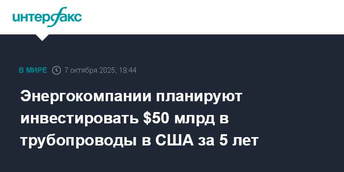 Москва. 7 октября. INTERFAX.RU - Энергетические компании готовятся инвестировать почти $50 млрд в строительство трубопроводов в США в следующие пять лет в условиях роста спроса на природный газ и увеличения объемов экспорта СПГ, пишет газета Financial Times.