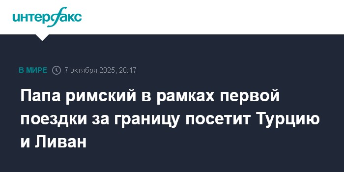 Москва. 7 октября. INTERFAX.RU - Папа римский Лев XIV совершит первое с момента избрания путешествие за рубеж: он посетит Турцию и Ливан в период с 27 ноября по 2 декабря, сообщает во вторник Vatican News.