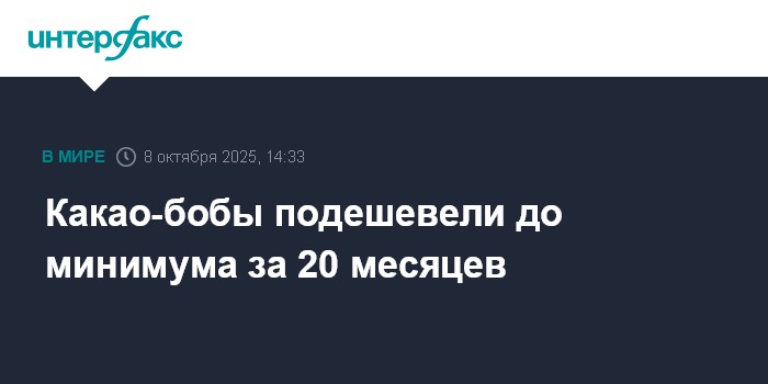 Москва. 8 октября. INTERFAX.RU - Котировки фьючерсов на какао опустились до минимумов за 20 месяцев, упав примерно вдвое по сравнению с недавними пиками.