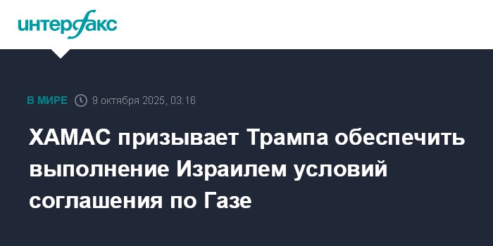Москва. 9 октября. INTERFAX.RU - Палестинское движение ХАМАС призвало президента США Дональда Трампа обеспечить выполнение Израилем условий первой фазы соглашения об урегулировании в секторе Газа, сообщает в четверг The Times of Israel.