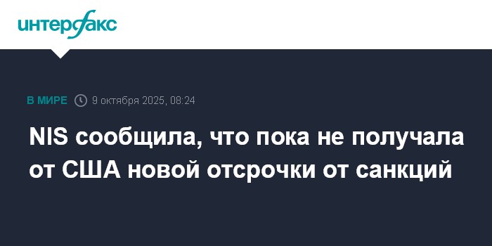 Москва. 9 октября. INTERFAX.RU - Сербская энергокомпания NIS (входит в "Газпром нефть") пока не получала от США новой отсрочки от санкций, которые вступили в действие 8 октября, сказано на сайте NIS.