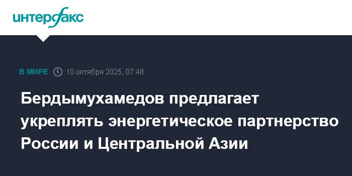 Москва. 10 октября. INTERFAX.RU - Президент Туркменистана Сердар Бердымухамедов предлагает России и странам Центральной Азии задействовать потенциал энергетического партнерства.