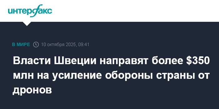 Москва. 10 октября. INTERFAX.RU - Шведские власти выделят $367,1 млн на приобретение вооружений и оборудование, которые позволят бороться с угрозой беспилотников, передают в пятницу западные СМИ.