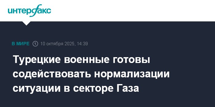 Москва. 10 октября. INTERFAX.RU - Турецкие военные готовы принять участие в любом задании по обеспечению мира в секторе Газа, заявил представитель Минобороны Турции Зеки Актюрк. Об этом пишет Hurriyet.
