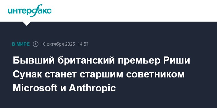 Москва. 10 октября. INTERFAX.RU - Бывший премьер-министр Великобритании Риши Сунак станет старшим советником и стратегическим консультантом Microsoft Corp. и ИИ-стартапа Anthropic.