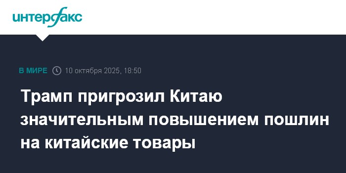 Москва. 10 октября. INTERFAX.RU - Американский президент Дональд Трамп заявил, что рассматривает возможность существенного повышения пошлин на китайские товары, ввозимые в США.