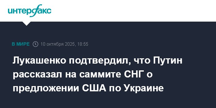 Москва. 10 октября. INTERFAX.RU - Президент Белоруссии Александр Лукашенко в кулуарах саммита лидеров стран СНГ в Душанбе рассказал, что президент России Владимир Путин за закрытыми дверями проинформировал коллег о переговорах с президентом США Дональдом Трампом на Аляске.