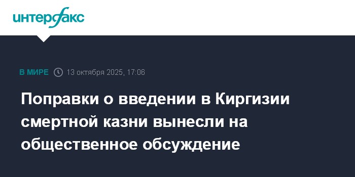 Москва. 13 октября. INTERFAX.RU - Администрация президента Киргизии вынесла на общественное обсуждение поправки в Конституцию страны, предусматривающие введение смертной казни.