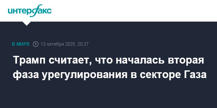 Москва. 13 октября. INTERFAX.RU - Президент США Дональд Трамп заявил, что реализация второго этапа мирного урегулирования в секторе Газа уже началась, сообщает в понедельник телеканал CBS.