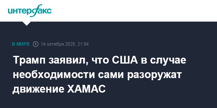 Москва. 14 октября. INTERFAX.RU - Президент США Дональд Трамп во вторник заявил, что в том случае, если ХАМАС не откажется от своих арсеналов, разоружением этого движения займется американская сторона.
