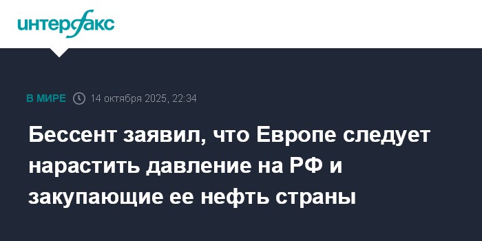 Москва. 14 октября. INTERFAX.RU - Министр финансов США Скотт Бессент заявил на встрече с премьером Украины Юлией Свириденко, что европейским странам нужно усилить меры против РФ, а также против стран, приобретающих российскую нефть.