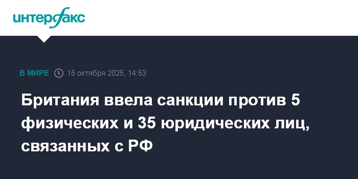 Москва. 15 октября. INTERFAX.RU - Лондон внес в санкционные списки по РФ пять физических и 35 юридических лиц, а также несколько десятков судов, сообщается в среду на сайте британского правительства.