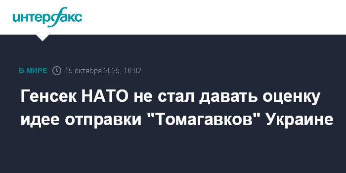 Москва. 15 октября. INTERFAX.RU - Генсек НАТО Марк Рютте на пресс-конференции в среду в Брюсселе заявил, что не будет давать оценку предложениям о передаче Вашингтоном "Томагавков" Украине, поскольку решение по этому вопросу должны принимать именно США, а не альянс.