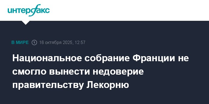 Москва. 16 октября. INTERFAX.RU - Нижняя палата парламента Франции - Национальное собрание - проголосовала против инициированного ультралевой партией "Непокоренная Франция" вотума недоверия правительству премьера Себастьена Лекорню, сообщает в четверг телеканал BFMTV.
