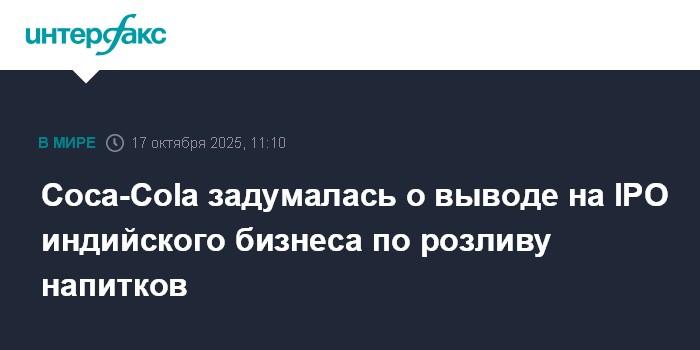 Москва. 17 октября. INTERFAX.RU - Coca-Cola Co. рассматривает возможность вывода на биржу своего индийского подразделения по розливу напитков Hindustan Coca-Cola Beverages Pvt., сообщает агентство Bloomberg со ссылкой на информированные источники.