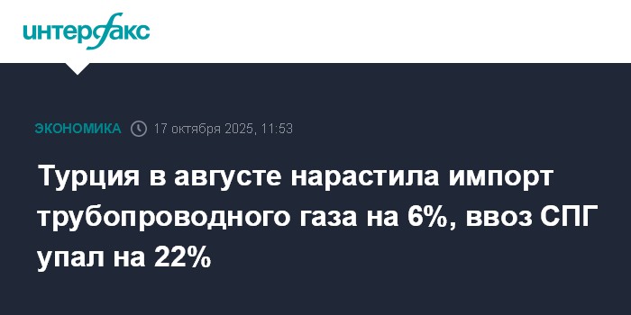 Москва. 17 октября. INTERFAX.RU - Турция в августе 2025 года импортировала суммарно 4,021 млрд куб. м природного газа (по трубам и через СПГ), что на 3% больше, чем годом ранее (3,893 млрд куб. м), сообщает Международное энергетическое агентство (МЭА). С начала года поставки выросли на 20% - до 37,551 млрд куб. м.