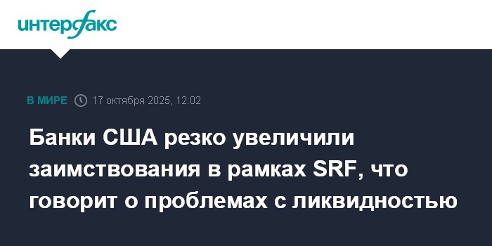 Москва. 17 октября. INTERFAX.RU - Американские банки резко увеличили заимствования в рамках краткосрочного кредитного механизма (standing repo facility, SRF) Федеральной резервной системы (ФРС), что может говорить о проблемах с ликвидностью, пишет газета Financial Times.