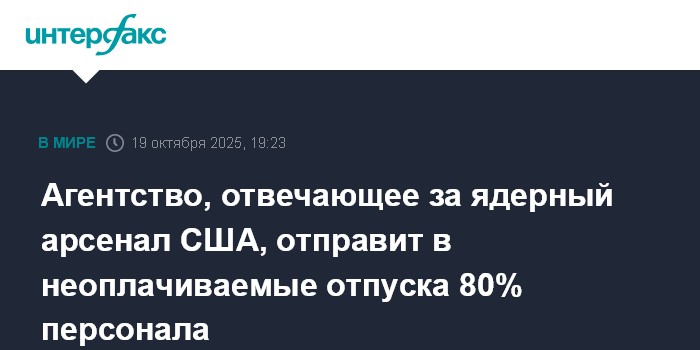 Москва. 19 октября. INTERFAX.RU - Национальное агентство США по ядерной безопасности (NNSA), которое отвечает за производство и хранение ядерного оружия, намерено отправить в неоплачиваемые отпуска 80% своих сотрудников из-за шатдауна, сообщил телеканал CBS.