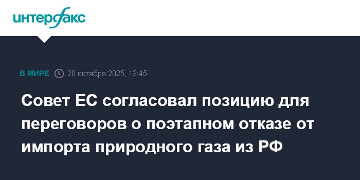 Москва. 20 октября. INTERFAX.RU - Совет ЕС объявил в понедельник, что согласовал свою позицию для переговоров с Европарламентом и Еврокомиссией по проекту регламента о поэтапном отказе от импорта российского природного газа.