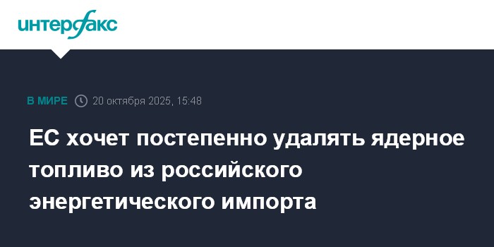 Москва. 20 октября. INTERFAX.RU - Планы поэтапного отказа ЕС от российского энергетического импорта предусматривают все виды топлива, включая ядерное, но его очередь еще не пришла, заявила официальный представитель Еврокомиссии (ЕК) Анна-Кайса Итконен.