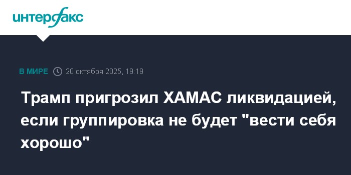 Москва. 20 октября. INTERFAX.RU - Президент США Дональд Трамп в понедельник заявил, что движению ХАМАС будет грозить полное уничтожение, если они не будут соблюдать условия сделки с Израилем.