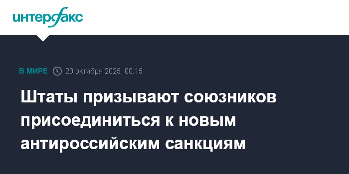 Москва. 23 октября. INTERFAX.RU - Глава Минфина США Скотт Бессент призвал союзников США присоединиться к новым санкция в отношении России, под которые, в частности, попали "Роснефть" и "ЛУКОЙЛ".