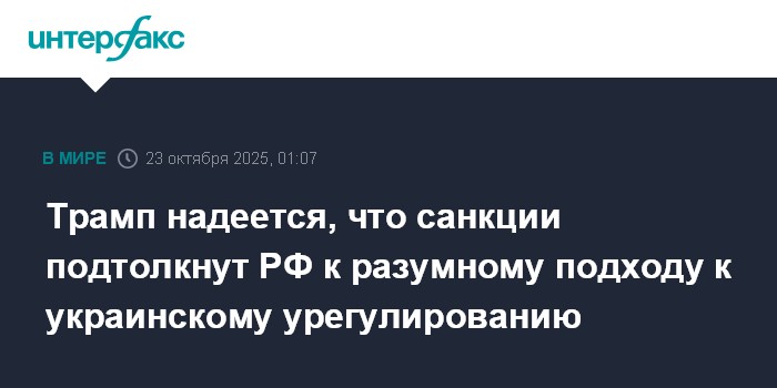 Москва. 23 октября. INTERFAX.RU - Президент США Дональд Трамп выразил надежду, что после введения Вашингтоном санкций против российских нефтяных компаний Москва будет придерживаться "разумного" подхода к урегулированию конфликта на Украине.