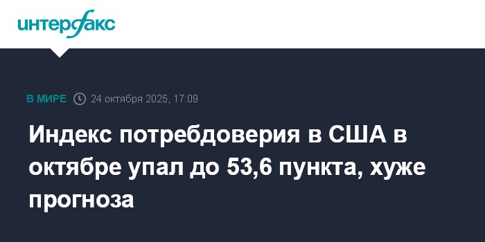Москва. 24 октября. INTERFAX.RU - Индекс потребительского доверия в США в октябре упал до 53,6 пункта по сравнению с 55,1 пункта в прошлом месяце, согласно окончательным данным Мичиганского университета, который рассчитывает этот показатель.