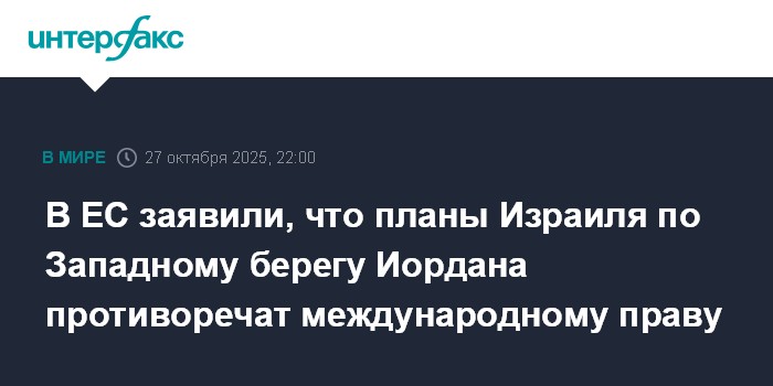 Москва. 27 октября. INTERFAX.RU - Предварительное одобрение в израильском парламенте - Кнессете - предложения о присоединении к Израилю территории Западного берега Иордана является нарушением международного права, заявил Ануар аль-Ануни, представитель главы дипломатии ЕС Каи Каллас.