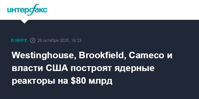 Москва. 28 октября. INTERFAX.RU - Американские Westinghouse Electric, Brookfield Asset Management и канадская Cameco в партнерстве с правительством США построят в стране ядерные реакторы на сумму не менее $80 млрд, говорится в сообщении компаний.