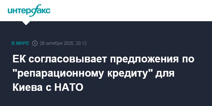 Москва. 28 октября. INTERFAX.RU - Еврокомиссия (ЕК) координирует предложения по "репарационному кредиту" ЕС для Украины в процессе подготовки со всеми сторонами, имеющими отношение к этому проекту, в том числе с НАТО, заявила пресс-секретарь ЕК Паула Пинью.