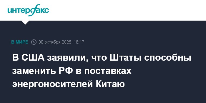 Москва. 30 октября. INTERFAX.RU - Министр энергетики США Крис Райт заявил, что в случае сокращения Китаем импорта энергоносителей из РФ Вашингтон сможет заменить Москву, поставляя нефть и газ Пекину.
