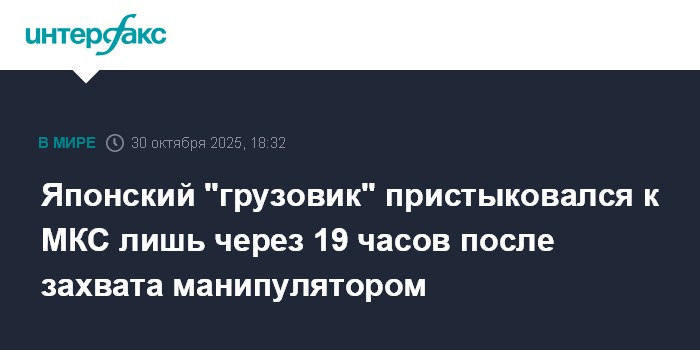 Москва. 30 октября. INTERFAX.RU - Новый японский грузовой корабль HTV-X1 состыковался с Международной космической станцией (МКС) в четверг только через 19 часов после того, как был захвачен ее "рукой"-манипулятором, следует из сообщения Аэрокосмического агентства Японии (JAXA).