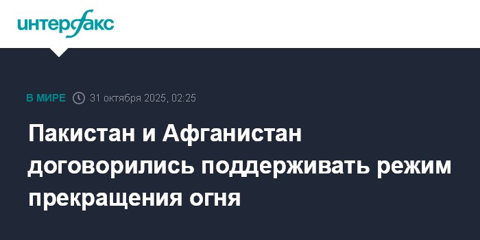 Москва. 31 октября. INTERFAX.RU - Пакистан и Афганистан согласились возобновить мирные переговоры и поддерживать режим прекращения огня после переговоров в Стамбуле, сообщило министерство иностранных дел Турции.