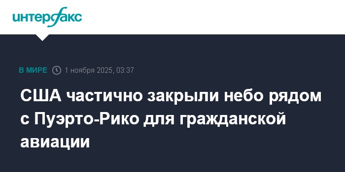 Москва. 1 ноября. INTERFAX.RU - Соединенные Штаты закрыли на период с 1 ноября по 31 марта участок воздушного пространства к востоку от Пуэрто-Рико в целях обеспечения специальных мер безопасности, следует из международного предупреждения для пилотов NOTAM.