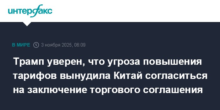 "Вы знаете, тарифы невероятны, потому что они действительно обеспечивают нам национальную безопасность. В качестве примера - когда они (Китай - ИФ) подняли перед нами и остальным миром вопрос с редкоземельными металлами и у нас не было тарифов, чтобы противостоять им, я немедленно ввел 100%-й тариф сверх того, что они уже платили. И когда я это сделал, они сразу же сели за стол переговоров", - заявил он в интервью CBS News.