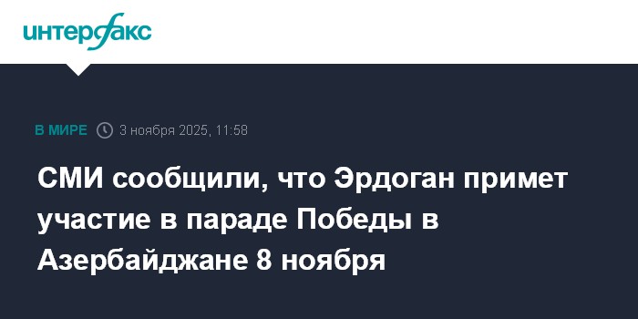 По данным азербайджанского агентства AПA, Эрдоган примет участие в параде Победы, который пройдет в Баку 8 ноября и приурочен к пятой годовщине завершения второй Карабахской войны.