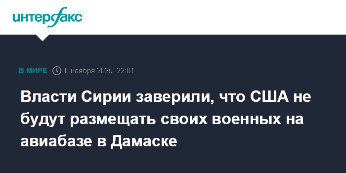 Москва. 6 ноября. INTERFAX.RU - Сообщения о том, что США разместят свой контингент на авиабазе в Дамаске, не соответствуют действительности, сообщает в четверг агентство САНА со ссылкой на источник в МИД САР.